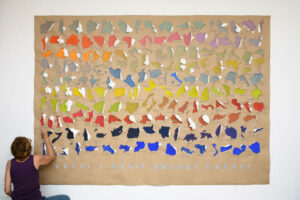 UNSTITCHED MAP II, 2019, red felt and blue cloth, 110 x 162 cm
