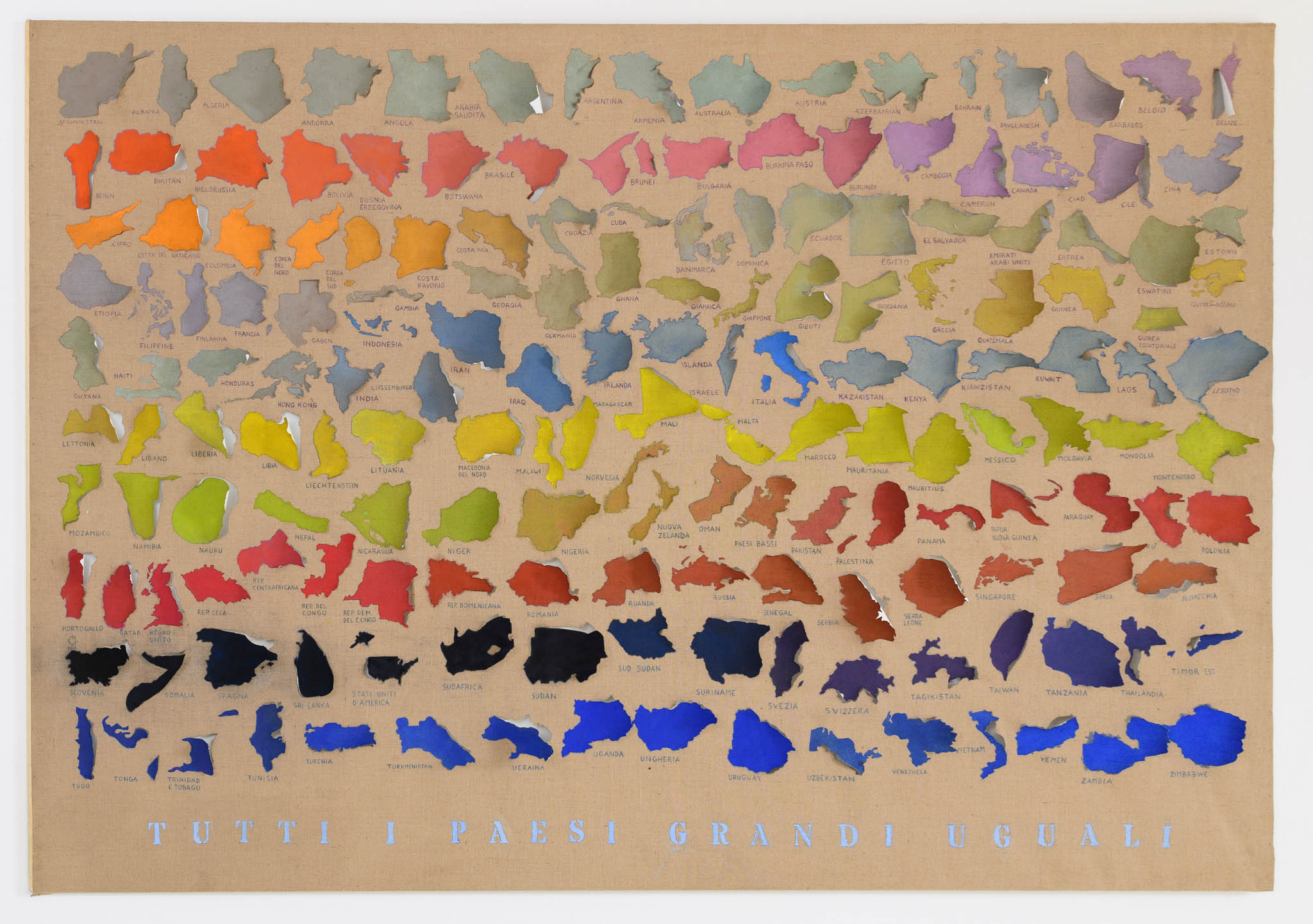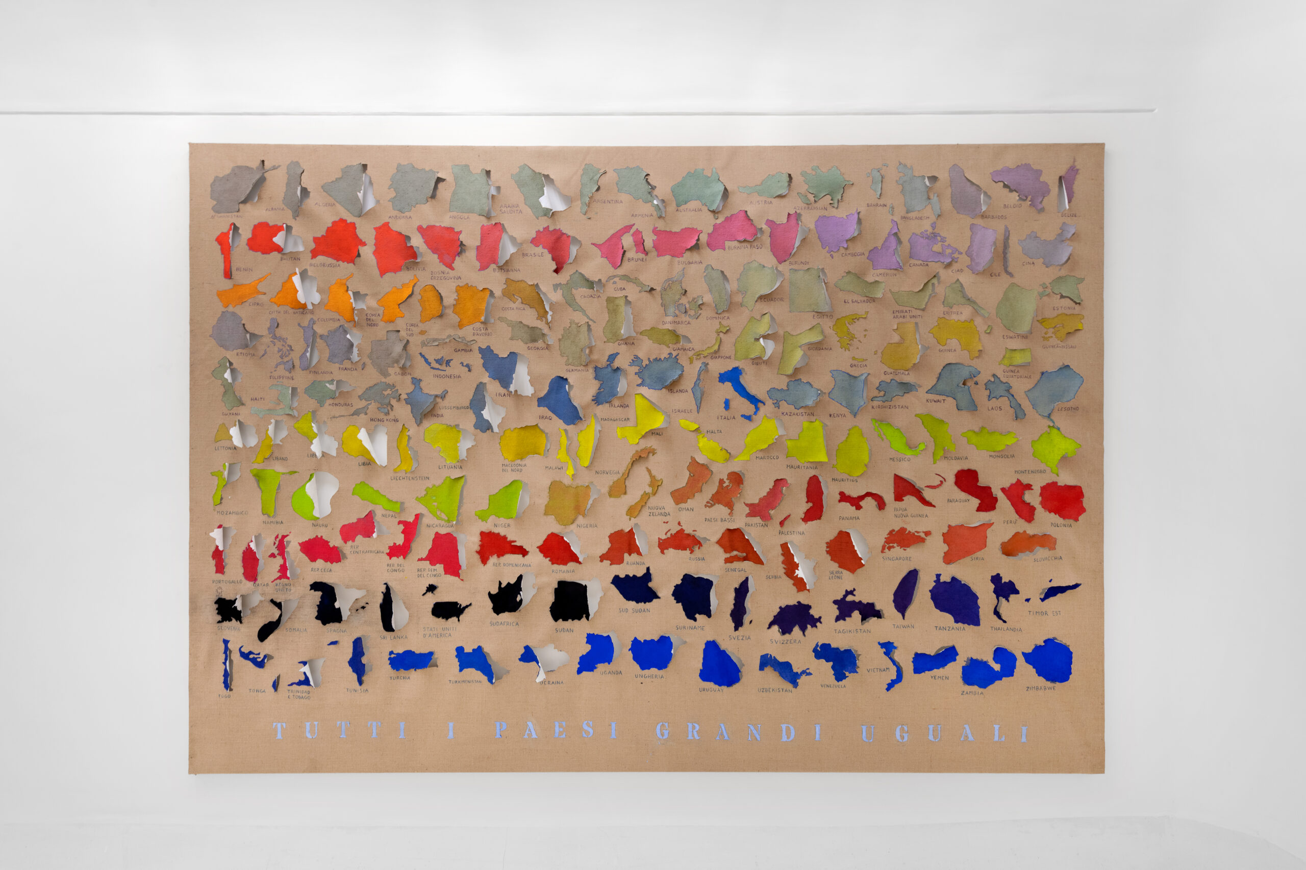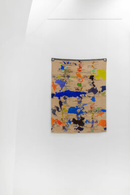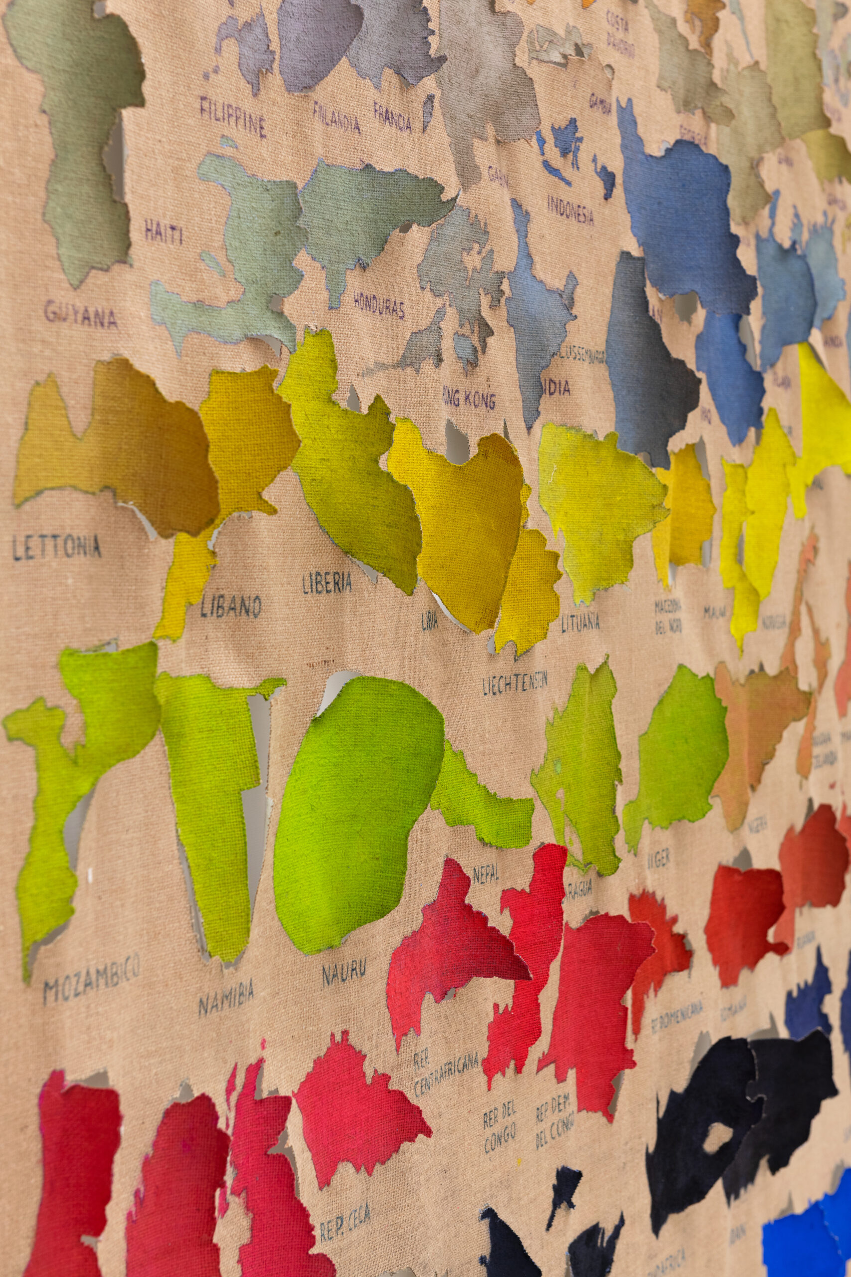 Looking at the series of countries, it’s easy to think of the maps conceived of by Alighiero Boetti and created by Afghan women as a potential precedent for work on the planet’s political geography. But on closer examination – beyond their shared cartographic basis – one of the few points of contact with Julie Polidoro’s canvases appears to be the way they’re hung on the wall without stretchers or frames, emphasising their materiality, the fabric’s weight, and its ability to react to environmental conditions. But Julie’s works are executed entirely by the artist herself, and are painted canvases that are cut and partially lifted from the background, acquiring a delicate and airy three-dimensionality while simultaneously losing the fixed rigidity of border-defined forms, once again subverting our gaze on the cartography of the world we know (or think we know). These are maps that are interrupted to allow for the passage of air, to restore a sense of shared belonging to this planet as the most important aspect of our existence, before and beyond any question of cultural identity. Maps that distance and bring together different countries based on criteria that have nothing to do with their geographic location or political definition, ignoring borders marked by natural elements (rivers, seas, mountain ranges) as well as those decided at conferences tables, made of straight lines drawn on maps.