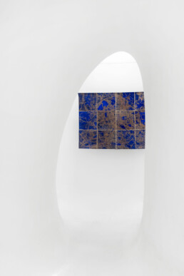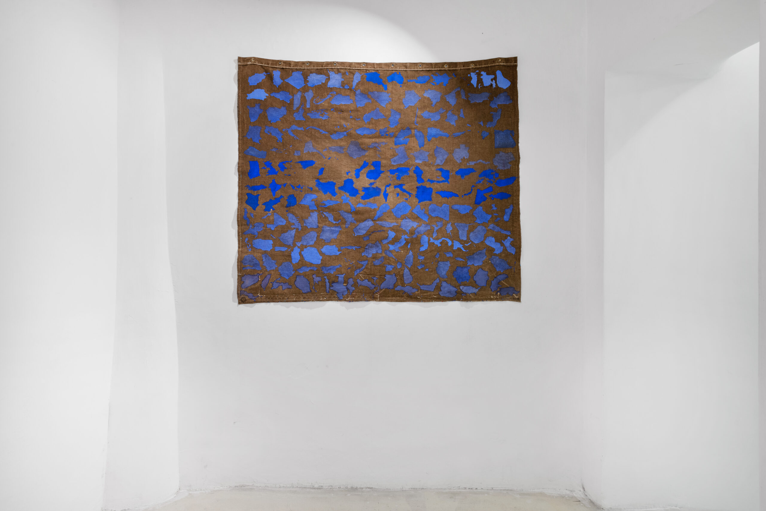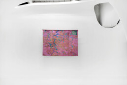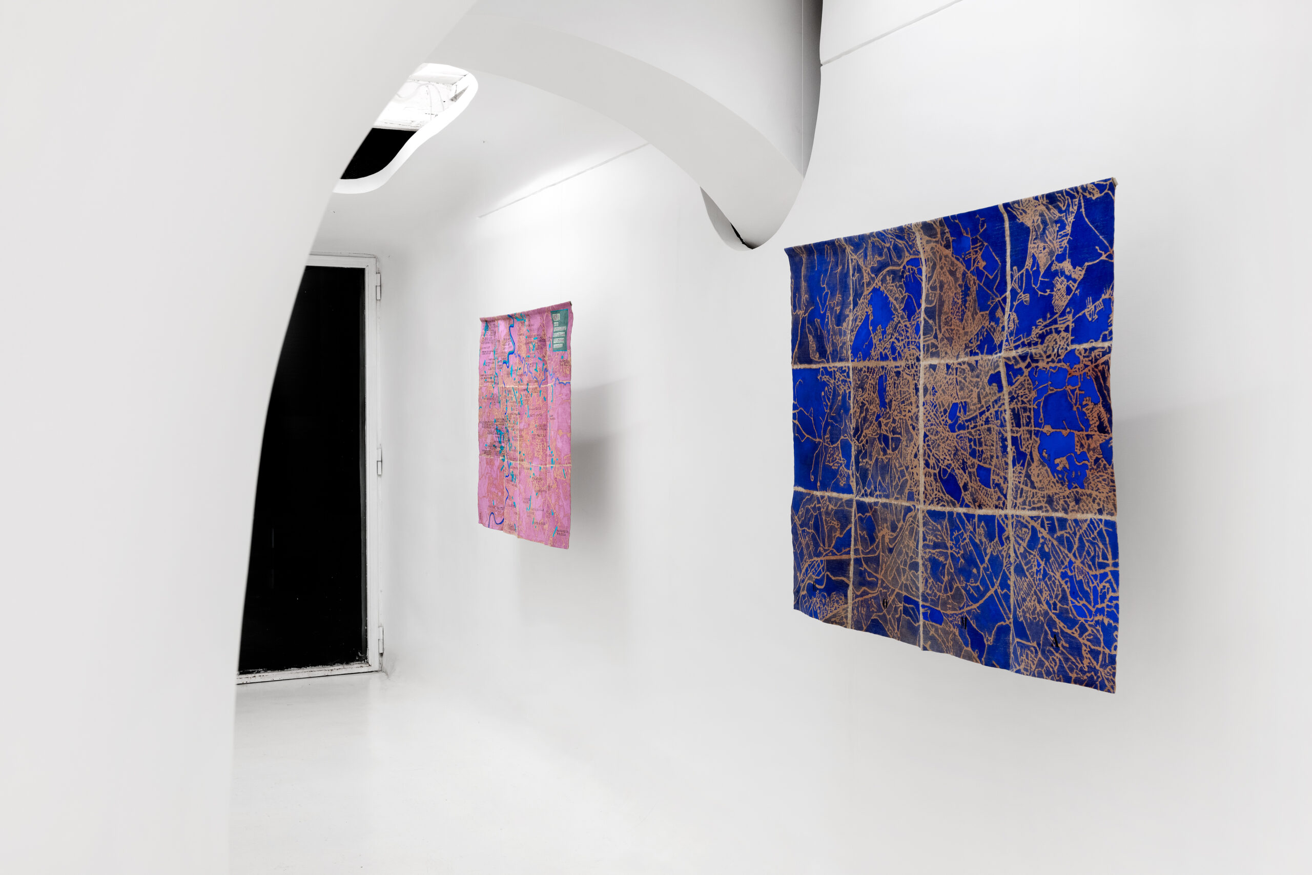 Looking at the series of countries, it’s easy to think of the maps conceived of by Alighiero Boetti and created by Afghan women as a potential precedent for work on the planet’s political geography. But on closer examination – beyond their shared cartographic basis – one of the few points of contact with Julie Polidoro’s canvases appears to be the way they’re hung on the wall without stretchers or frames, emphasising their materiality, the fabric’s weight, and its ability to react to environmental conditions. But Julie’s works are executed entirely by the artist herself, and are painted canvases that are cut and partially lifted from the background, acquiring a delicate and airy three-dimensionality while simultaneously losing the fixed rigidity of border-defined forms, once again subverting our gaze on the cartography of the world we know (or think we know). These are maps that are interrupted to allow for the passage of air, to restore a sense of shared belonging to this planet as the most important aspect of our existence, before and beyond any question of cultural identity. Maps that distance and bring together different countries based on criteria that have nothing to do with their geographic location or political definition, ignoring borders marked by natural elements (rivers, seas, mountain ranges) as well as those decided at conferences tables, made of straight lines drawn on maps.