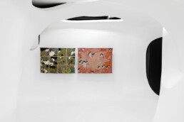 Questo emerge con determinazione in particolare in Control Landscape, la serie di quattro tele dedicate ai centri di detenzione e confinamento. Frutto di una serie di riprese satellitari stratificata nel tempo, le immagini sono poi riportate sulla tela, tradotte in pittura in un processo che ne altera completamente il significato, dalla ripresa che veicola con precisione una serie di dati a una immagine che cerca di interrogarsi sull’aspetto di un paesaggio del controllo. Nulla indica sulla mappa la loro posizione esatta, e anzi i centri restano di fatto volutamente nascosti nella parcellizzazione dell’immagine del territorio in settori colorati, in una tarsia cromatica apparentemente festosa. Ma sotto lo scorrere indifferente delle nuvole, Julie Polidoro attira la nostra attenzione sul carattere politico del paesaggio e della sua rappresentazione.