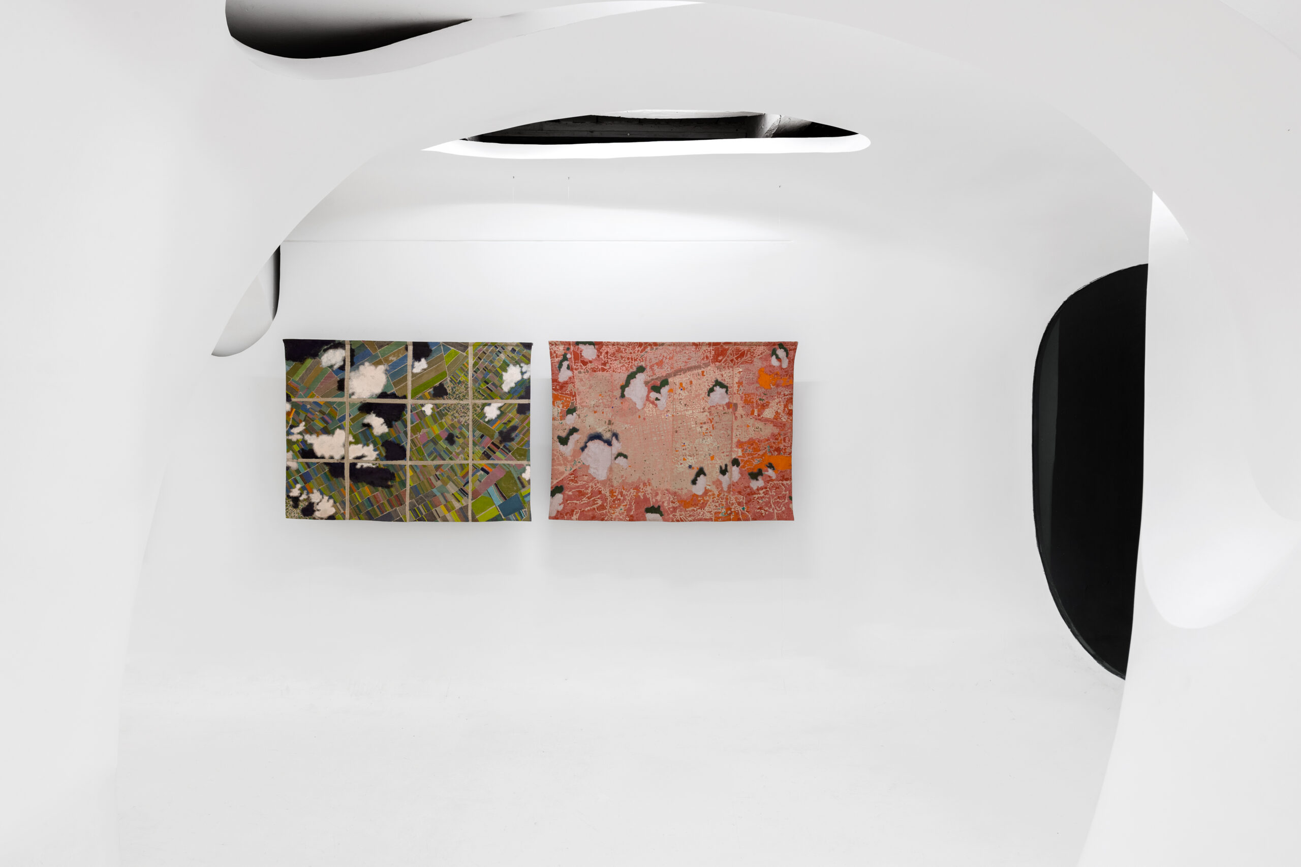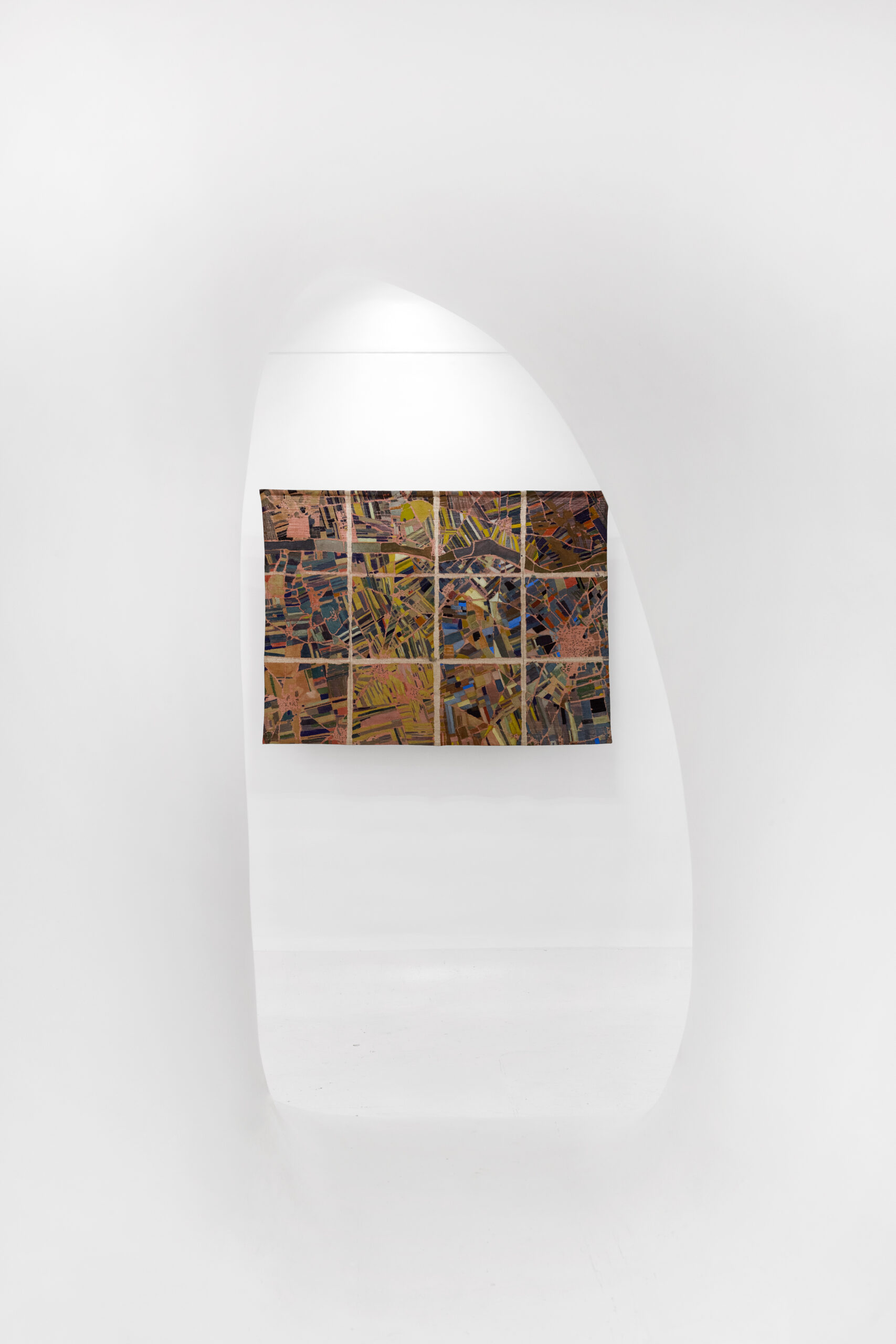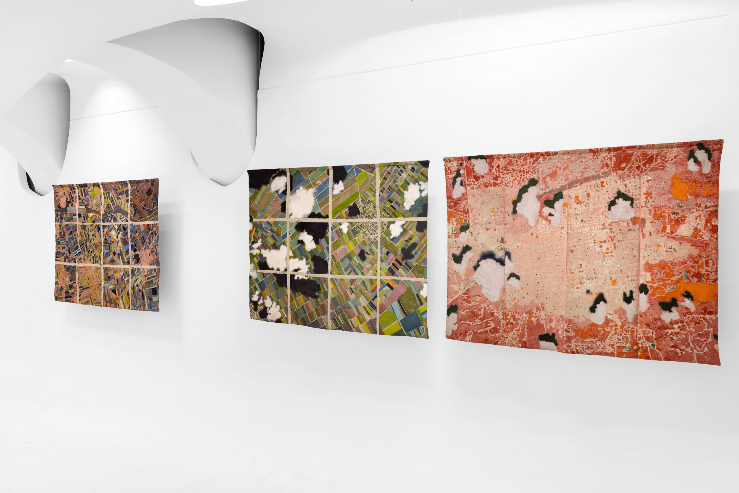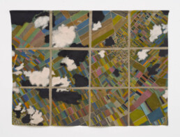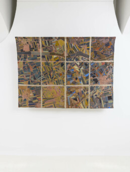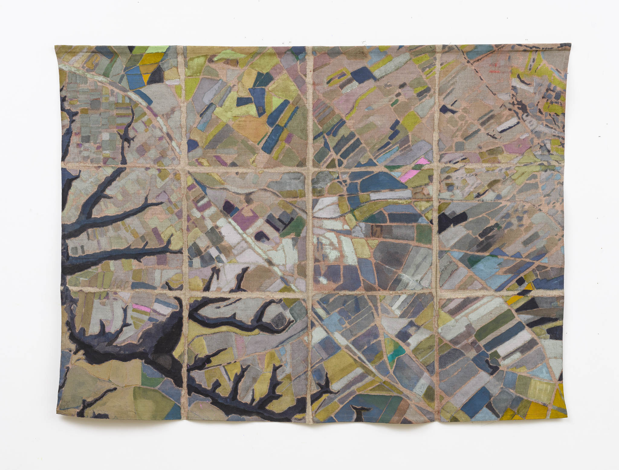 Ma esiste anche una diversa scala, più ravvicinata e ambigua alla vista. Con lo sguardo zenitale delle mappe satellitari sorvoliamo mosaici di campi agricoli o di strade urbane che tuttavia scopriamo essere i dintorni di un centro di detenzione. O ancora, cerchiamo la Roma che conosciamo nella voluta indeterminatezza della rappresentazione pittorica. Le mappe di Julie Polidoro sono il frutto di un processo e conservano una profondità temporale grazie a immagini che a loro volta sono la somma di sei fotografie satellitari scattate in sei momenti diversi, scalati nel corso di anni. Il segno marcato delle pieghe della tela aggiunge una distanza, ritma l’immagine, cancella definitivamente ogni traccia di illusionismo prospettico o proiettivo. Come dice l’artista, non sono mappe fatte per “dire la verità”. Sono mappe rese inservibili dalla loro frammentazione, o meglio sono investite di una nuova e diversa funzione, tutta da leggere nei termini di un invito alla riflessione civile.