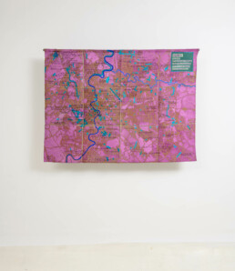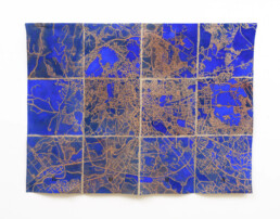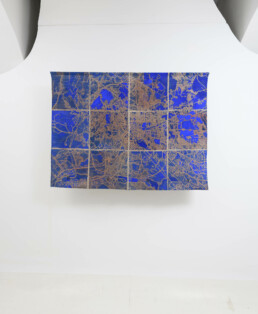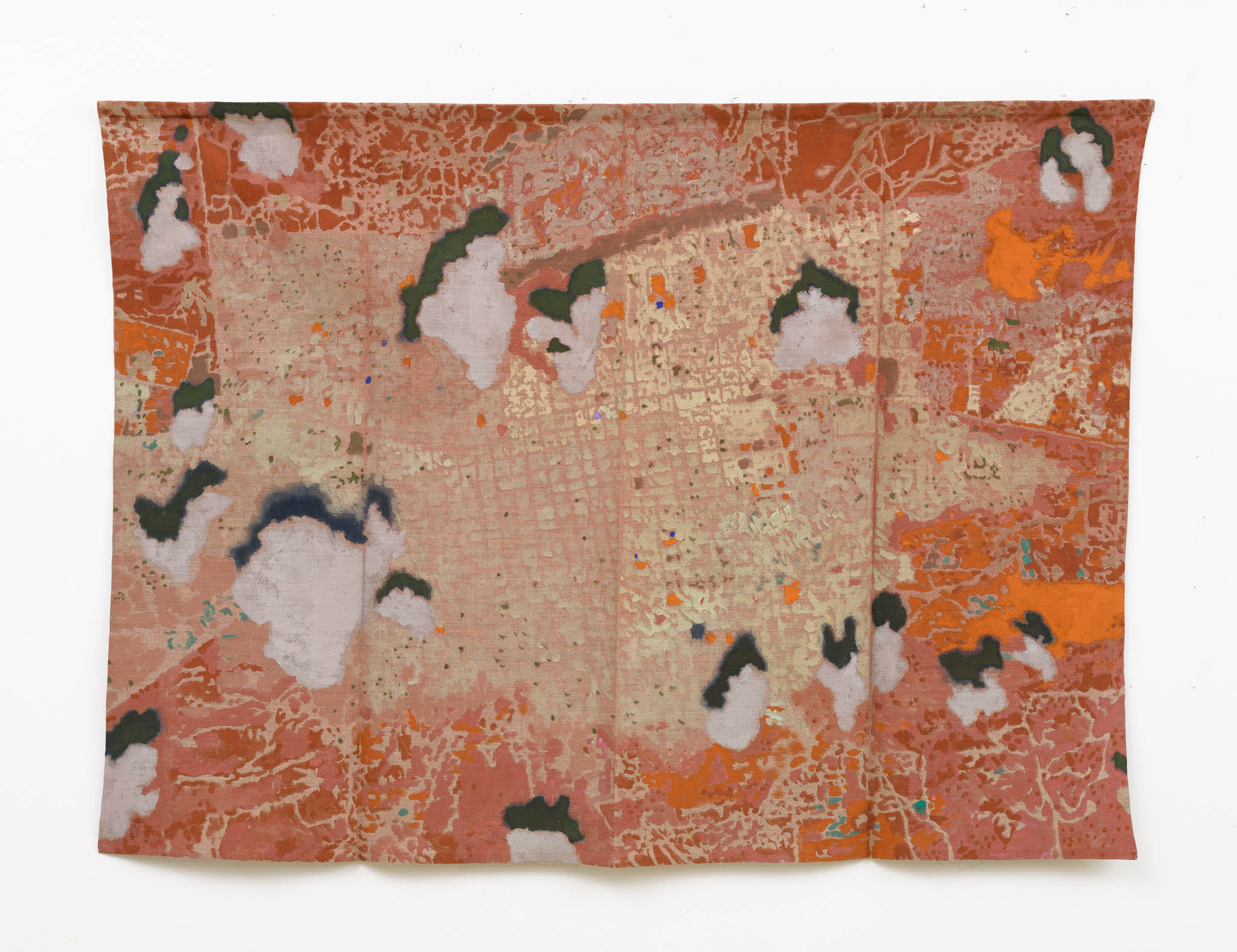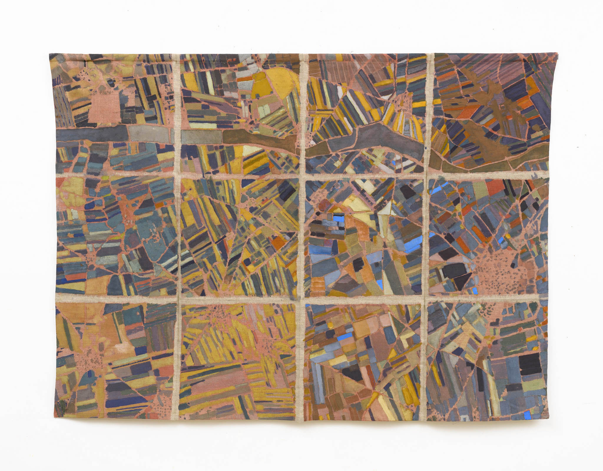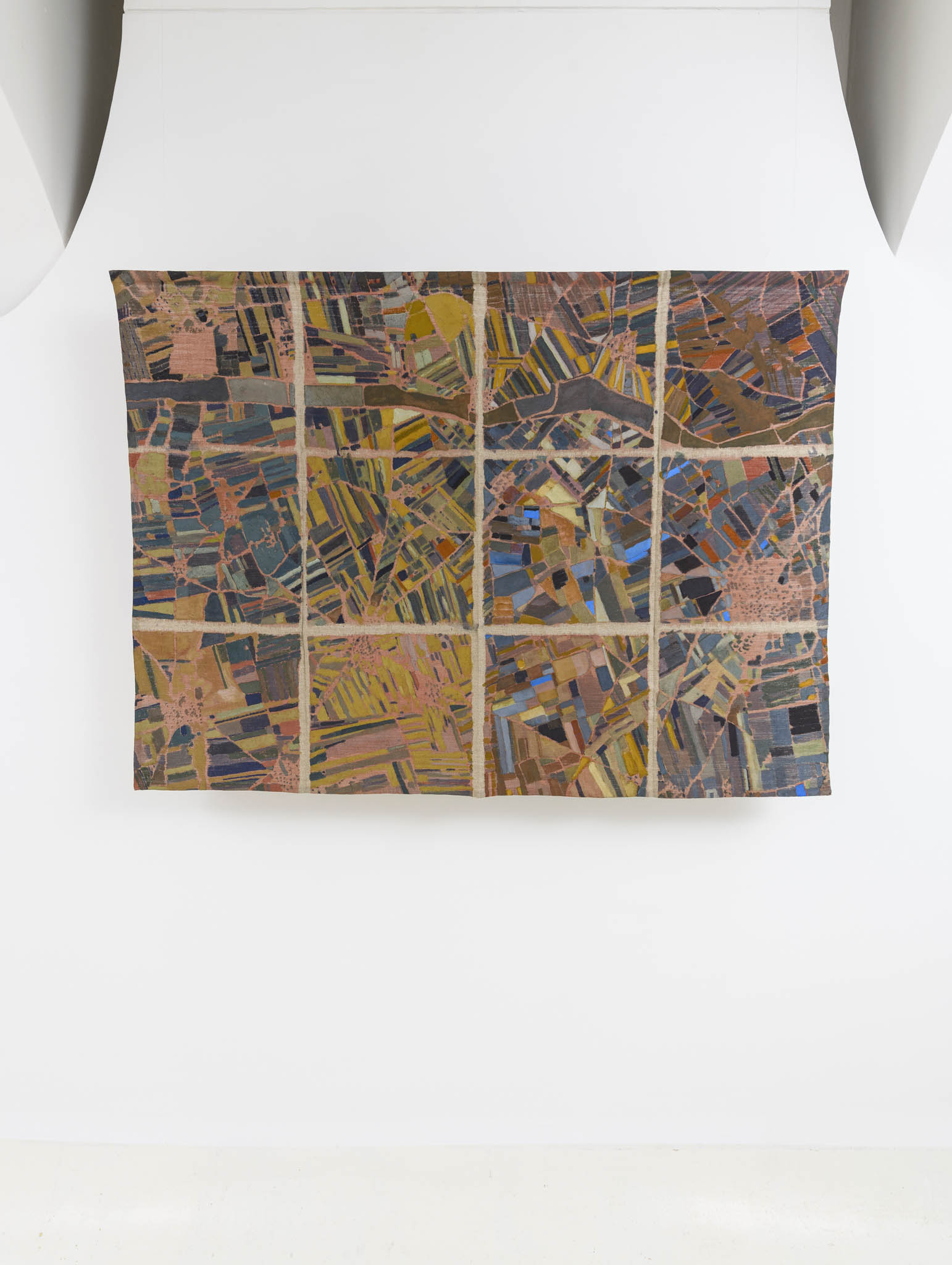 Ma esiste anche una diversa scala, più ravvicinata e ambigua alla vista. Con lo sguardo zenitale delle mappe satellitari sorvoliamo mosaici di campi agricoli o di strade urbane che tuttavia scopriamo essere i dintorni di un centro di detenzione. O ancora, cerchiamo la Roma che conosciamo nella voluta indeterminatezza della rappresentazione pittorica. Le mappe di Julie Polidoro sono il frutto di un processo e conservano una profondità temporale grazie a immagini che a loro volta sono la somma di sei fotografie satellitari scattate in sei momenti diversi, scalati nel corso di anni. Il segno marcato delle pieghe della tela aggiunge una distanza, ritma l’immagine, cancella definitivamente ogni traccia di illusionismo prospettico o proiettivo. Come dice l’artista, non sono mappe fatte per “dire la verità”. Sono mappe rese inservibili dalla loro frammentazione, o meglio sono investite di una nuova e diversa funzione, tutta da leggere nei termini di un invito alla riflessione civile.