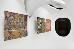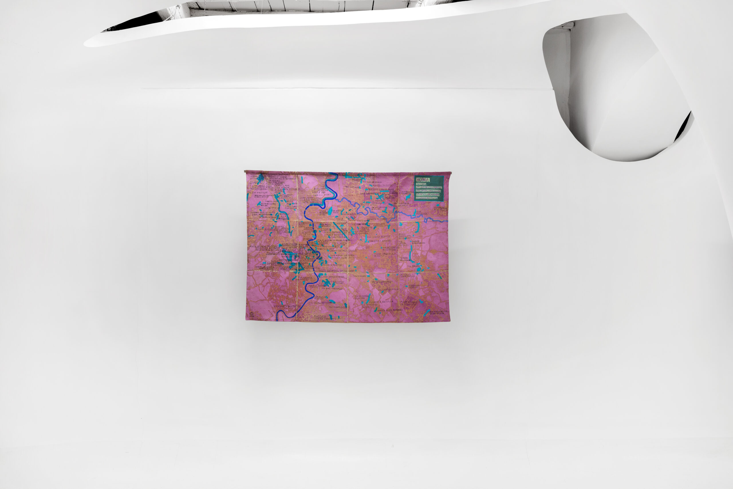 But there is also another scale, closer and more ambiguous to the eye. With the overhead perspective of a satellite map, we fly over mosaics of agricultural fields and urban roads, only to realise they are the areas surrounding a detention facility. Or still, we search for the Rome we know in the intentional vagueness of the painted image. Julie Polidoro’s maps come from a process and preserve temporal depth because they have images that are themselves the sum of six satellite photographs taken at six different times, over the span of years. The pronounced creases on the canvas add distance, give the image rhythm, and definitively erase any illusion of perspective or projection. As the artist says, these maps are not made to “tell the truth”. They are maps that have been made impractical by their fragmentation, or rather, they have taken on a new purpose, to be interpreted as an invitation to civic reflection.