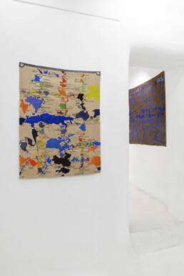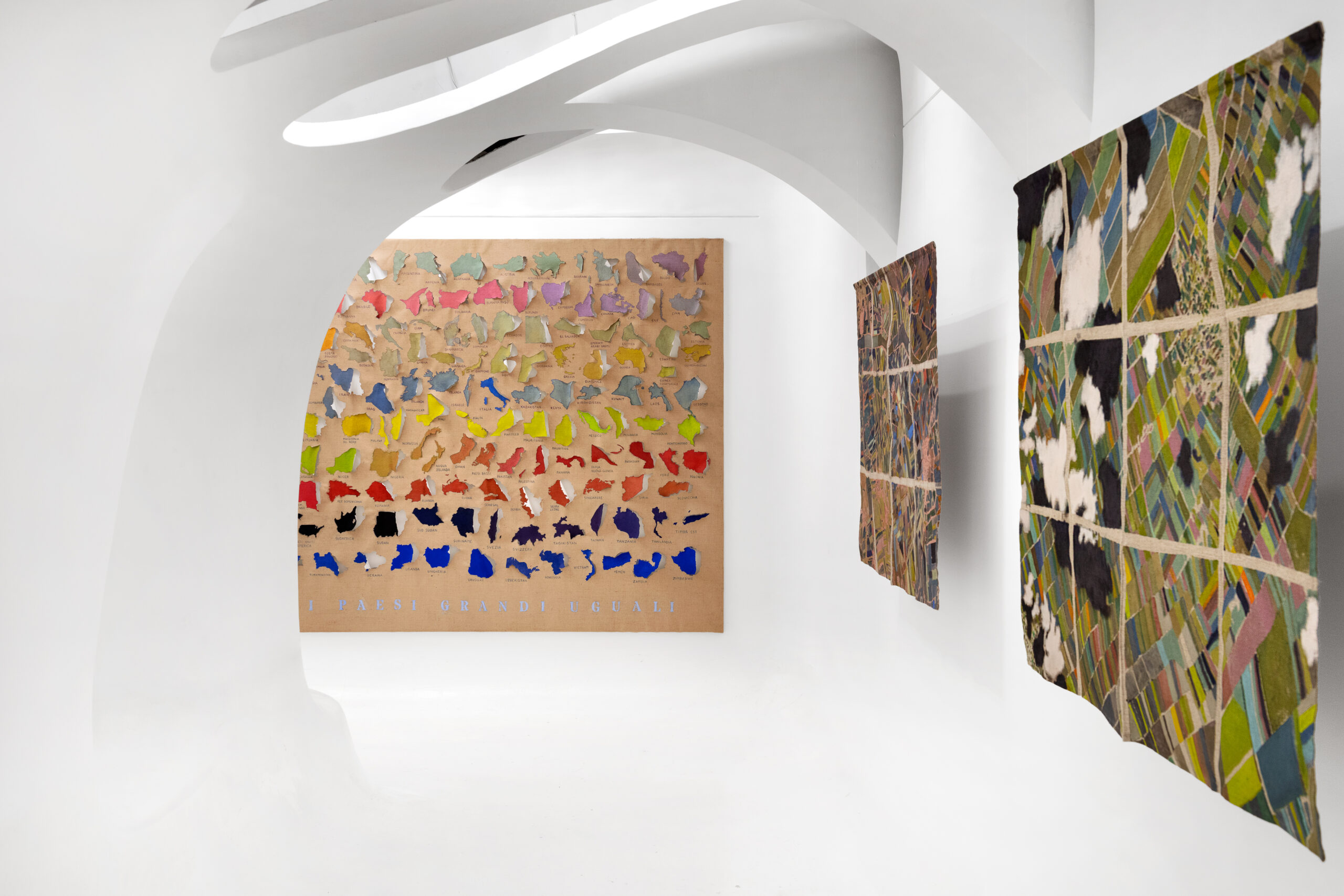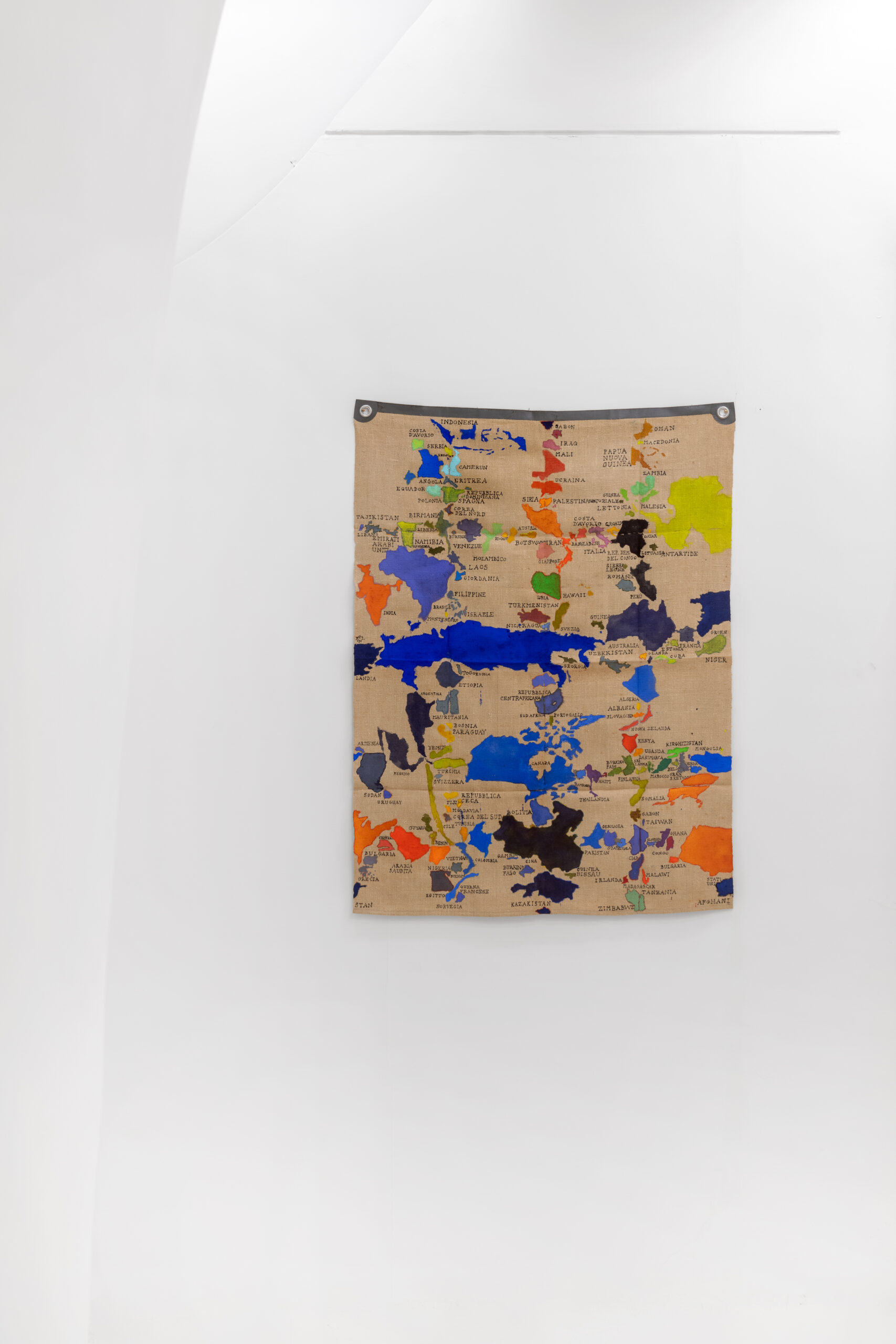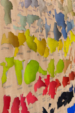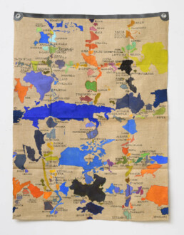 Se guardando le serie dei paesi è facile pensare alle mappe pensate da Alighiero Boetti e realizzate dalle donne afghane come un possibile precedente di lavoro sulla geografia politica del pianeta, a ben vedere – al di là della comune base cartografica – uno dei pochi punti di contatto con le tele di Julie Polidoro appare il modo di appenderle al muro senza telaio e senza cornici, enfatizzando così la loro peculiare materialità, il peso del tessuto, la capacità di reagire alle circostanze ambientali. Ma le opere di Julie sono interamente eseguite in prima persona, e sono tele dipinte, tagliate, parzialmente sollevate rispetto allo sfondo in modo da acquisire una delicata e ariosa tridimensionalità e allo stesso tempo da perdere la fissità e la rigidità della forma determinata dai confini, ancora una volta di sovvertire il nostro sguardo sulla cartografia del mondo che conosciamo (o crediamo di conoscere). Sono mappe interrotte per permettere il passaggio dell’aria, per restituire il senso di comune appartenenza al pianeta come carattere prioritario della nostra esistenza, prima e al di là di ogni questione legata a una possibile identità culturale. Sono mappe che allontanano e avvicinano paesi diversi secondo criteri che nulla hanno a che vedere con la loro collocazione geografica e con la loro definizione politica, scartando sia dai confini segnati da elementi naturali (fiumi, mari, catene montuose), sia da quelli fissati a tavolino e fatti di linee rette tracciate su carte geografiche.