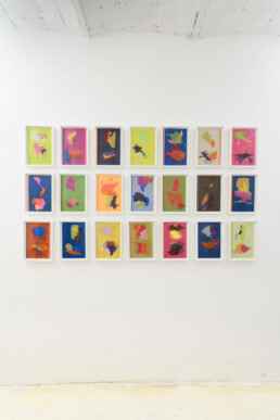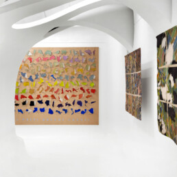 Julie Polidoro paints the world, but in a way that constantly disorients us, unsettles us, forces us to question what we see before our eyes and that disrupts the geography we’ve studied, with its world map inevitably centred on the West. Julie’s world is expanded, decentralised, de-hierarchised. The countries have been made the same size and are grouped by colour, or they share borders based on an imaginary system, or they become unrecognisable as semi-transparent outlines that overlap, blurring their original forms.