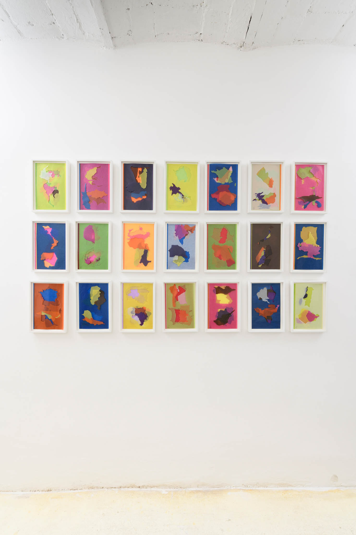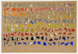 Julie Polidoro dipinge il mondo, ma lo fa in un modo che costantemente ci disorienta, ci turba, ci costringe a interrogarci su quello che vediamo davanti ai nostri occhi e che scardina la geografia che abbiamo studiato, con il suo planisfero inevitabilmente centrato sull’Occidente. Quello di Julie è un mondo espanso, delocalizzato, degerarchizzato. I paesi hanno tutti la stessa dimensione e sono ordinati per colore, oppure condividono confini secondo un ordine immaginario, o ancora perdono la loro riconoscibilità attraverso una operazione di sovrapposizione di sagome semi-trasparenti che finiscono per confondere le forme di partenza.
